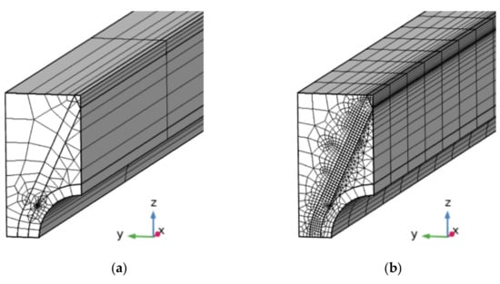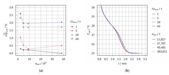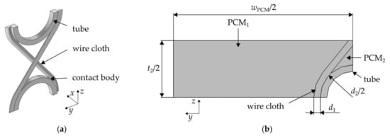 To shorten the simulation time, we decreased the complexity of the wire cloth. A characteristic element of the wire cloth heat exchanger is shown in Figure 8a. For the simplification, the 3D structure was first reduced to 2D geometry under consideration of possible symmetries (see Figure 8b). The wire cloth area considers the wire as well as the PCM by effective material properties for density , specific heat capacity and thermal conductivity . The properties are calculated based on the volume fraction of PCM in the cross section according to