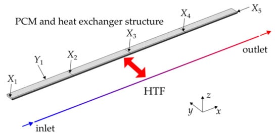 Three-dimensional (3D) simulation domain for PCM and heat exchanger structure together with 1D HTF domain. Surfaces X1 to X5 are implemented for the determination of convection. The surfaces are evenly distributed along the -direction.