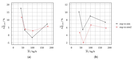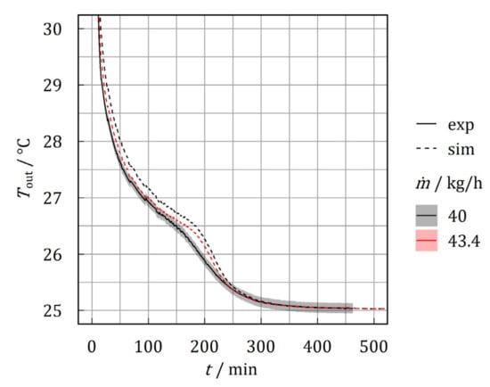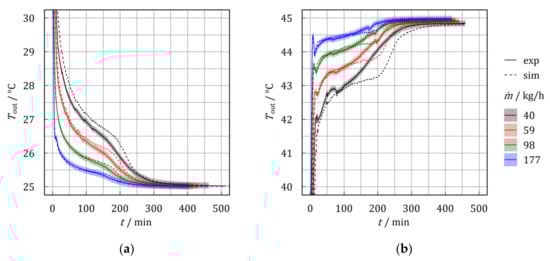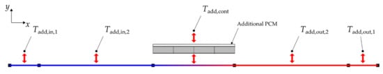 With the heat loss, the inlet and outlet temperature are corrected. The temperatures are measured at the main manifolds. The heat exchangers are connected with hoses to the main manifolds. As mentioned in Section 2.4.1, a Styrodur insulation (BASF SE, Ludwigshafen, Germany) is applied for the hoses. Nevertheless, the highest losses are expected at the hoses due to the complex installation. Therefore, we assume that half of the losses occur each between the inlet temperature sensor and the storage and between the storage and the outlet temperature sensor. This assumption is proven as there is a good agreement of the corrected inlet and outlet temperature and the PCM temperatures in the storage during the stationary periods. The temperatures are corrected by