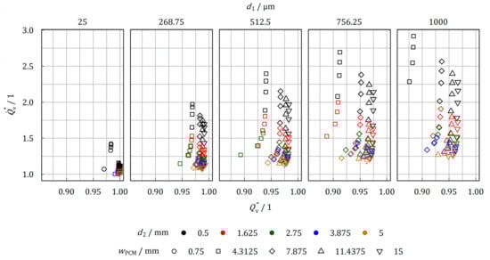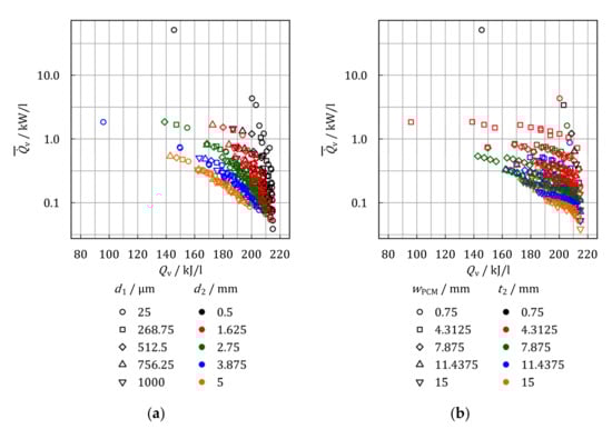 The wire cloth performance is investigated in detail for stainless steel as material. The identified relationships are also valid for aluminum as material. The mean thermal power per volume is plotted versus the volume specific storage capacity in Figure 17. In general, a high power implies a reduced storage capacity. The higher power is reached by a higher number of pipes and wires in the storage. This results in a reduced volume available for the PCM and therefore reduces the available capacity. The highest power is reached for small values of tube diameter , wire diameter , tube distance and distance between two heat exchangers . Such combination leads to a high heat transfer surface area in relation to the storage volume. Hence, the thermal resistances are small and the power is high. Moreover, the highest storage capacities are reached for small and and high and since the highest PCM fraction can be achieved due to the small heat exchanger material amount.
