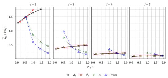 A bigger tube diameter and wire diameter increase the thermal power. The mean distance between the PCM and the heat exchanger is reduced, thus, the thermal resistance is small and the power is high. The power is more influenced by and for smaller and (smaller ). For these cases the thickness of the PCM is smaller and the wire can significantly reduce the thermal resistance. For bigger and (higher ) the thermal resistance is dominated by the PCM thickness between the tubes and the neighboring heat exchangers. For the tube distance and the distance between two heat exchangers , a smaller value increases the thermal power as the thermal resistances get reduced. A reduction of keeps the heat exchanger geometry unchanged but reduces the thickness of the PCM by using more parallel heat exchangers. By a reduction of , the tubes are becoming closer and more tubes are used per heat exchanger. Thus, the thickness of the PCM between the tubes is reduced. Furthermore, it should be noted that with smaller the heat exchanger becomes more like a plate heat exchanger and the direction of the heat flow becomes more perpendicular to the heat exchanger. Therefore, the thermal resistance between PCM and HTF decreases. Further, an increase of leads to a lower reduction of the power compared to an increase of . This comparison is possible because the values of the two parameters are varied equally. Due to the wire cloth, the thermal resistance between the tubes is lower compared to between the heat exchangers. This allows the thermal power to be maintained at a higher level.