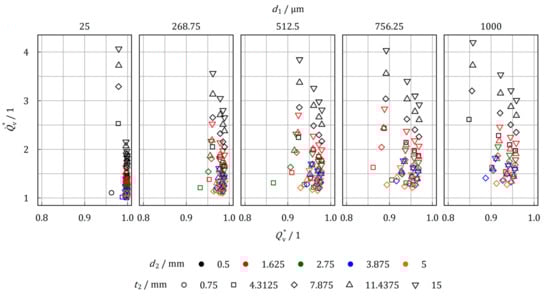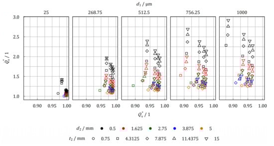 The results for heat exchanger made out of aluminum are shown in Figure 21 in dependence of , and . Due to the higher thermal conductivity of aluminum of 215 versus 15 W/m/K for stainless steel, the thermal power can be increased to a maximum factor of 4.20 compared to the tube bundle. This corresponds to an increase by a factor of 1.44 compared to stainless steel. Unlike for stainless steel, the second highest increase of thermal power by the wire cloth is reached for the smallest of 25 µm, although the influence of is significantly higher for this configuration. This indicates a significant better compensation of the smaller wire cross sections by the higher conductivity of aluminum.