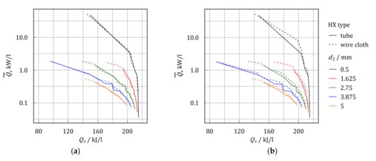Pareto-optimal configurations of all wire cloth and tube heat exchanger (HX) variations for different tube diameter for steel (a) and aluminum (b) of the mean volume specific thermal power.