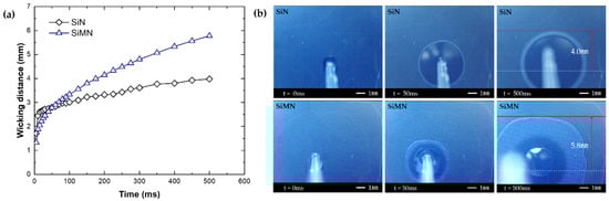 Capillary wicking test. (a) Wickability of the samples (Wicking distance—Time), (b) spreading images on SiN, SiMN.
