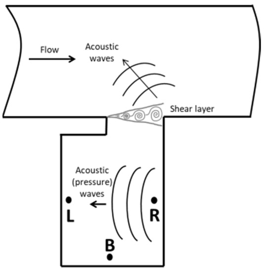 The nature of the flow in an open-type cavity (the type that will be analysed in this work) is determined mainly by the feedback mechanism between the shear layer within the cavity neck and the generated acoustic waves (Figure 1). The acoustic wave is generated by vortices that are formed in the shear layer, which hit the trailing edge of the cavity. They form as a result of Kelvin–Helmholtz instability, which is caused by a significant difference in velocity between the stream flowing over the cavity and the fluid inside. These vortices are formed at the leading edge of the cavity and then are transported along the neck towards the trailing edge, where they collapse and become asource of significant pressure pulsations. This place is treated as an acoustic source, and generated pulsations propagate towards the leading edge at the speed of sound.