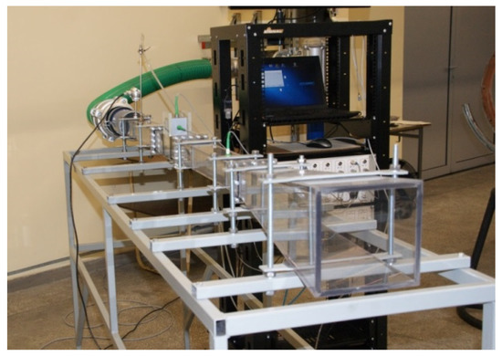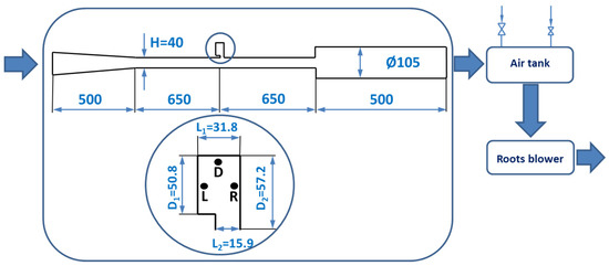 The test stand, with its air preparation system, is presented in Figure 2. The installation is designed to work in negative gauge pressure. The test stand (Figure 3) consists of three main segments. The first is the converging inlet part with an opening angle of 6°. The next part is a rectangular channel with a 50 × 40 mm cross-section. The cavity is located in the middle part of the channel. The last element of the test stand is the transition from a rectangular to circular cross-section and a connection to the air preparation system.