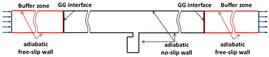The scheme of the adopted computational domain is shown in Figure 5. The length of the inlet section and its height were assumed according to Figure 2. The computational domain contains two buffer zones where relatively coarse numerical mesh was used. The buffer zones eliminate reflections of the acoustic waves from the assumed boundary conditions.