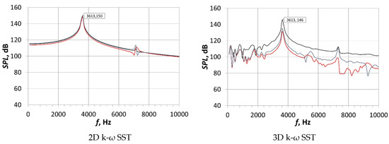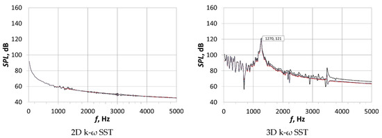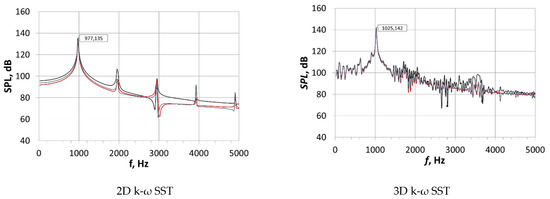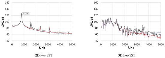 Strong pressure pulsations that are well visible in both of the CFD models (Figure 9) and in the case of the experimental data (Figure 10) are obtained for the velocity equal to 40 m/s. In this case, the spectrum of the sound pressure level obtained based on numerical simulations is similar to experimental tests. The basic frequency is determined correctly in all cases. The only difference is the lack of a strongly defined second harmonic for the three-dimensional numerical model.