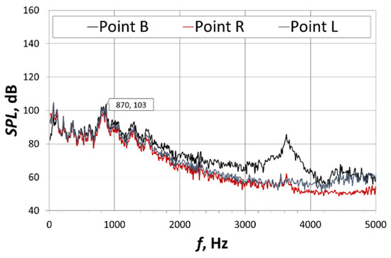 The relatively low value of the sound pressure at point R is the consequence of its location far below the region where the vortices collide with the wall. Therefore, the higher-pressure pulsations on the right wall of the cavity will occur instead in the vicinity of the main flow channel. The highest discrepancy between the SPL values for the analysed points was obtained in the case of a two-dimensional model.