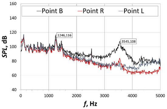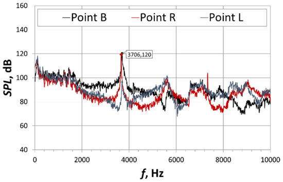 Figure 18 compares the course of the acoustic pressure fluctuations obtained in the case of two-dimensional and three-dimensional CFD simulations for a flow velocity of 70 m/s and Figure 19 shows the corresponding experimental data. An analysis of the pressure fluctuations course for the three measuring points (Figure 1) shows that a sinusoidal wave is obtained, similar to the velocity of 50 m/s. There are, however, several significant differences between the nature of the pressure fluctuation at 50 m/s and the considered higher flow rates. The results of the CFD analysis show that at 70 m/s and 80 m/s, the acoustic pressure fluctuations at the bottom of the cavity (point B) are in the opposite phase to the points located on the sidewalls of the cavity (points L and R). Therefore, in this case, there is a classic feedback mechanism, which was described by Rossiter. The second important difference is the significant variations in the waveform of sound pressure fluctuations obtained based on two- and three-dimensional analysis.