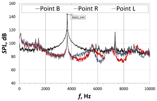Figure 20 and Figure 21 show the corresponding sound pressure level spectrum for a main channel velocity of 70 m/s. The step change in the frequency of the generated acoustic wave, which reaches the value of 3663 Hz, is visible. For a velocity of 50 m/s, it was 1235 Hz. The beginning of the change in the frequency of the generated acoustic wave was already visible at a velocity of 60 m/s (Figure 17).