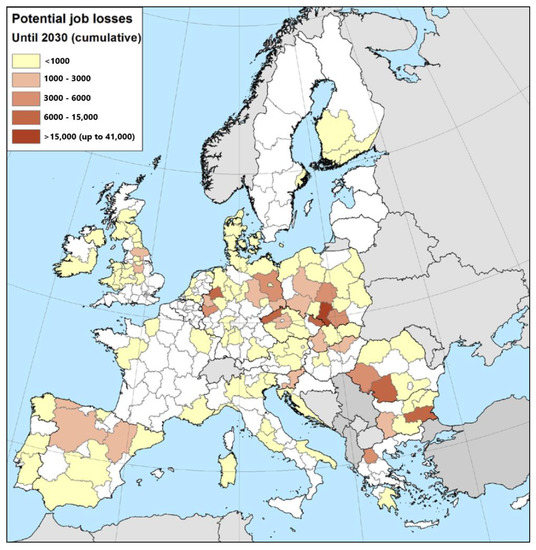The worldwide trend of the substitution of fossil energy by atomic and renewable energy sources has had a significant impact on the demand for raw mineral materials [1]. As a result, there are numerous mining projects and initiatives aimed at exploring and excavating new resources of mineral raw materials [2,3]. Growing needs in the field of renewable energy and electric mobility are related to the high importance of critical raw materials (CRMs) [4]. In turn, due to EU environmental policy and lack of competitiveness [5], most underground hard coal mines will be closed down over the next 15–20 years. Between 2014 and 2017 alone, 27 coal mines in Poland, Germany, the Czech Republic, Hungary, Romania, Slovakia, Slovenia, and the United Kingdom were closed [6]. Furthermore, considering the efficiency of underground coal mining it is expected that most coal regions will be subjected to termination by 2030, which poses a great risk of local economic crisis and numerous job losses in these areas. The map of potential job losses related to coal mine closure in the EU is presented in Figure 1.