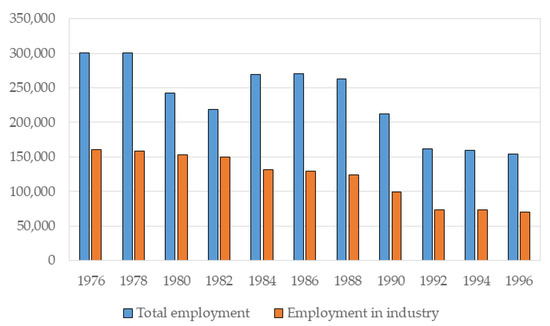 As past experiences showed, the unplanned and sudden transformation of mining areas has a negative impact on the economy [5,8] and environmental sustainability [9,10,11,12,13,14]. One of the inglorious examples of such an impact was the rapid termination of underground hard coal mining in the Lower Silesian Coal Basin (LSCB) in Poland, at the end of the 20th century. According to [15] after mines liquidation, the local unemployment increased from 15% in 1997 up to 32% in 2002. The consequences of the liquidation of industries are best illustrated by the data over the years. In the former Wałbrzych Voivodeship, employment in industry (in total) amounted to 148.5 thousand in 1980, 99.1 thousand in 1990 (the year when the decision to close the Wałbrzych mines was made), and 70.1 thousand in 1996 [16]. At the same time, in 1996, the last coal cart was excavated at the “Thorez” mine. Employment in the Wałbrzych Voivodeship for two decades is shown in Figure 2.