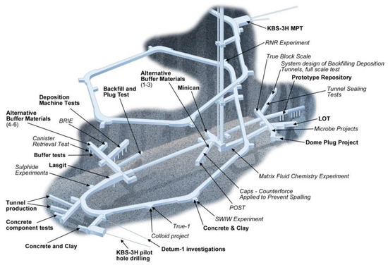 Allocation of experiments at Äspö HRL [57]. Reprint with permission of Äspö HRL, 2021, https://www.skbinternational.se.