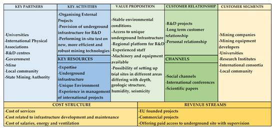 A business model describes the logic of how a company intends to maintain its business lucrative, as well as the rationale of how a company or an organization creates, delivers, and captures value [63]. A business can be described with a business model canvas. Here, the business model canvas consists of nine building blocks: customer segments, value proposition, channels, customer relationships, revenue streams, key resources, key activities, key partnerships, and cost structure. One of its key benefits is bringing clarity to the core aims of an organization while identifying its strengths, weaknesses, and priorities. The example of the Canvas survey worksheet developed for conceptual laboratory which is considered to set up in one of KGHM mines in future is presented in Figure 4.