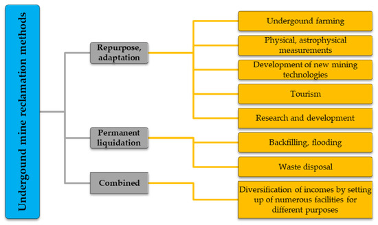 Considering the numbers of closed mines and those which are planned to be set up, it may be concluded that even with the rapid development of new mining projects, most workers will stay unemployed. At the same time, post-mining underground space, in most cases, has not been considered as a suitable place for activities other than mining and are often filled with rocks and water to prevent its further effect on the local environment [17,18,19]. In general, widely considered methods of underground mines reclamation aim to utilize the most cost-effective and efficient way of backfilling to prevent further ground subsidence after mine closure [20].