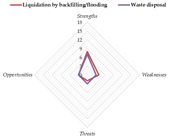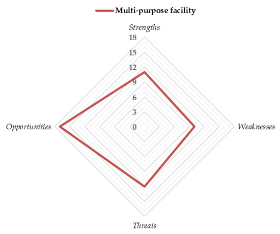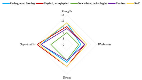 According to performed analyses, one may conclude that the most commonly used approach, based on permanent liquidation of underground workings in general, is the safest solution due to the low number of threats and weaknesses (Figure 9). Such an approach does not require further investments, and therefore is preferably utilized by most of the mining companies. However, more sophisticated solutions aimed at further exploitation of underground spaces may bring numerous advantages to local society as well as the science and mining industry. In fact, strengths and opportunities in analyzed cases are distributed parallel to weaknesses and threats related to each type of venture. As it may be noticed in analyzing Figure 10, the most promising facilities are those which are focused on astrophysical and physical measurements and those which are strictly related to performing R&D activities. At the same time, these approaches are burdened with the highest risk of project implementation. In turn, faculty dedicated solely for the development of new mining technologies is expected to provide the lowest incomes and is characterized by a low number of opportunities, and simultaneously is not characterized by many weaknesses and threats.