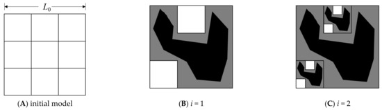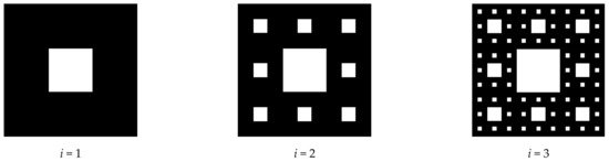 The 2D solid mass fractal model is shown in Figure 3, which can be used to simulate the distribution of uniform pore at different scales. The black part is the iteration region. At a certain iterative scale, solid and pore sizes gradually decrease with the increase in iterations. Finally, the iteration region disappears.