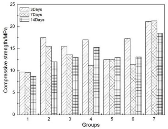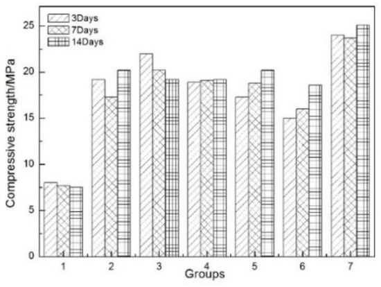 According to the design of the fractal grading model, for the cement slurry system with the 35% and 45% added sand [22,23,24,25,49,50,51], the solid phase formulas are Formulas (1)–(7), as shown in Table 2 and Table 3. The fluid-phase admixture is adjusted based on different working environments. The density of the cement slurry is 1.88 g/cm3. To cure at 180 °C, the samples were placed in a high-temperature pressurized curing kettle (OWC-9380) at 20 MPa, with the formulas corresponding to cement samples with D values of 2.52, 2.55, 2.58, 2.61, 2.64, and 2.67. They are cured for 3, 7, and 14 days and compared with blank control (cement + water). The experimental results are shown in Figure 5 and Figure 6.