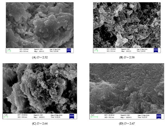 After cement stone samples with Formulas (2), (4), (6) and (7) (35% sand addition) are cured at 180 °C for 7 days, micro-morphology analysis is performed. The corresponding fractal dimension D values are 2.52, 2.58, 2.64, and 2.67. The experimental results are shown in Figure 8.