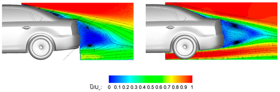 To ensure that the wake structures of each base geometry were also simulated correctly, a comparison was made against the experimental measurements published by [18]. Figure 3 compares the normalised velocity magnitude and in-plane velocity streamlines in the wake at the vehicle centreline. Deviations in the velocity magnitudes are visible between the two investigation methods, which are largely attributed to the differences in geometry details including the engine bay, rims, and underbody roughness as well as the Reynolds number. Despite these differences in magnitudes, the main characteristics of the wake structures of each configuration are well captured.