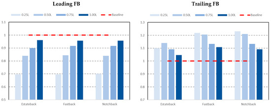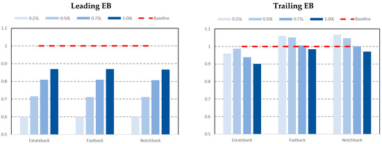 The drag ratios for an EB leading the platoon as shown in Figure 5 (left), would always be favourable and would be expected to increase linearly with the inter-vehicle spacing based on the results from other studies [25,26,27,28]. When the order is reversed, i.e., where the EB is following different base geometries as shown in Figure 5 (right), it does not necessarily achieve any energy savings when it is following a FB and/or NB at inter-vehicle spacing of 0.5 L and 0.25 L. This unfavourable effect would dissipate as the inter-vehicle spacing becomes greater than 0.75 L when the leading vehicle wake interaction with the EB is reduced. The effects of the FB and NB on the following EB drag ratios are relatively similar, which is expected given the similarities observed in the wake (in Figure 4). However, with a leading EB, a reduction was observed in the drag ratios on the following EB, despite a noticeable peak at an inter-vehicle spacing of 0.5 L. These observations corroborate with published data on similar EB geometries [7] where this peak was attributed to the increase of pressure drag on the frontal half of the following vehicle due to the leading vehicle flow trajectory that impinges on the following vehicle’s bumper.