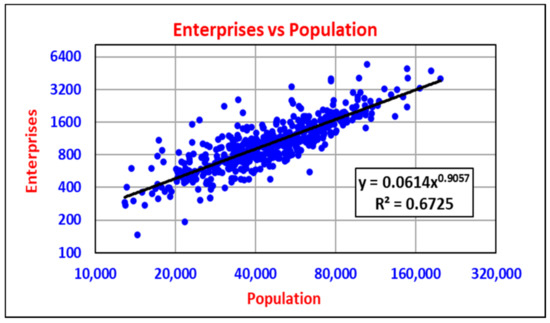 As proportionalities have been recorded between population numbers and the number of enterprises of human settlements, e.g., for South African towns [45,46], United States counties [43,47], and United States metropolitans [35], the second step in the investigation was to establish if population-based orderliness is also present in the group of micropolitans studied here. This step allowed the determination of whether population strength (i.e., a higher percentage of a total micropolitan population) is associated with higher tourism or manufacturing sector strengths. In other words, does population strength increase or decrease the potential for Dutch disease?