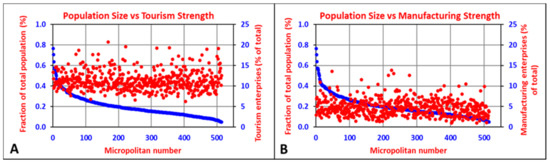 Comparison of ranked population strengths (percentage of total micropolitan population, blue dots) of micropolitans with (A) the strength of their tourism enterprises (percentage of total tourism enterprises, red dots) and (B) the strength of their manufacturing enterprises (percentage of total manufacturing enterprises, red dots).