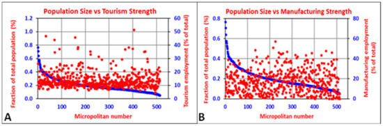 Comparison of ranked population strengths (percentage of total micropolitan population, blue dots) of micropolitans with (A) the strength of their tourism employment (percentage of total tourism employment, red dots) and (B) the strength of their manufacturing employment (percentage of total manufacturing employment, red dots).