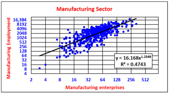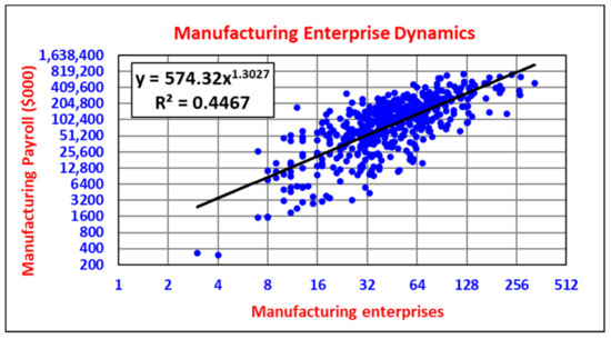 Manufacturing payrolls are also invariantly related to the number of manufacturing enterprises in micropolitans (Figure 6). The power law is also strongly super-linearly associated with the number of manufacturing enterprises. Table 5 indicates that manufacturing payrolls increase by about 150% for every doubling (100% increase) of manufacturing enterprise numbers. With only 10 manufacturers in a micropolitan, the payroll per enterprise is approximately USD 1.15 million. With 160 manufacturers in a micropolitan, the payroll per enterprise increases to approximately USD 2.7 million (Table 5).