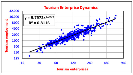 Employment in the tourism sector is also associated, in a scale-invariant manner, with the number of tourism enterprises in micropolitans. Tourism employment is slightly super-linearly associated with the number of tourism enterprises (Figure 7). Table 6 indicates that tourism employment increases by 114% for every doubling (100% increase) of tourism enterprise numbers. With only 30 tourism enterprises in a micropolitan, there are about 14 employees per enterprise. With 480 tourism enterprises in a micropolitan, there are about 18 employees per enterprise.