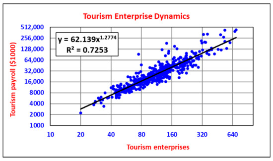 Tourism payrolls are also strongly super-linearly associated with the number of tourism enterprises (Figure 8). Table 7 indicates that tourism payrolls increase by about 140% for every doubling (100% increase) of tourism enterprises. With only 30 tourism enterprises per micropolitan, the payroll per enterprise is approximately USD 160,000. With 480 tourism enterprises per micropolitan, the payroll increases to approximately USD 345,000 per enterprise (Table 7).