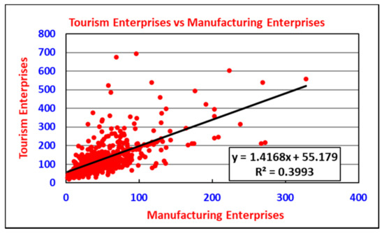 The linear relationship between manufacturing and tourism enterprises in United States micropolitans.