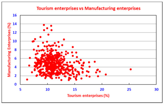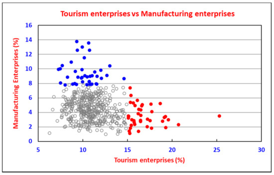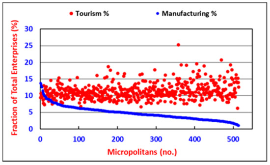 The 40 micropolitans with the strongest tourism sectors were, therefore, compared with the 40 micropolitans with the strongest manufacturing sectors (see groups in Figure 11), using enterprise strength (fraction of total enterprises) as the measure. The tourism enterprise strength of a selected tourism group was more than 15%, and the strength of a selected manufacturing group was more than 7.8%. Notably, the largest group of approximately 430 micropolitans had less than 15% tourism enterprises and less than 7.8% manufacturing enterprises (grey dots in Figure 11).