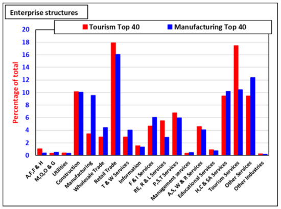 The enterprise structures of the top 40 tourism and the top 40 manufacturing United States micropolitans. The structure reflects the proportion (%) of the total sector enterprise numbers relative to the total group enterprise numbers. The explanation of the abbreviations of the business sectors is presented in Table 1.