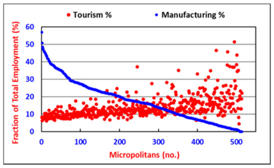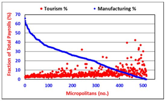Two observations about the economic dynamics of US micropolitan statistical areas (hereafter called micropolitans) deserve further consideration. Firstly, despite the reduction in manufacturing activities mentioned above, in 2018, manufacturing was still listed as one of seven major attributes of micropolitan success in rural America [7]. For instance, manufacturing was the dominant industry and represented more than 20 percent of all jobs in the cities of Findlay and Jasper compared with 7.9 percent for the US overall [7]. Secondly, combinations of tourism, recreation, and the attraction of lifestyle amenities drove economic success in a majority of the top 20 most dynamic micropolitans [8]. Tourism and manufacturing are both apparently important economic sectors in micropolitans. However, can this occur concurrently?