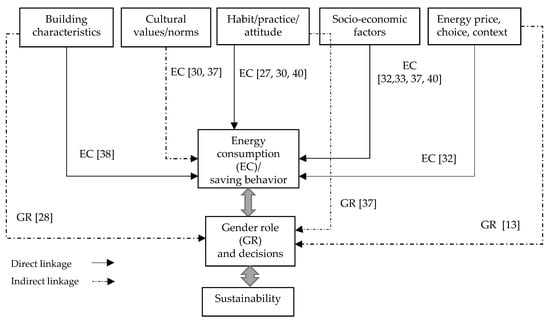 The energy model development directs towards an energy-saving approach and generates important linkages with energy, gender, and sustainability, as shown in Figure 3. Building characteristics, habits, socio-economic factors, and energy price choices have direct and cultural values/norms that indirectly link to the energy consumption pattern and energy-saving behavior (Figure 3). While cultural norms and habits are directly linked to gender issues, building characteristics and energy market price choices are less considered to be gender issues. Gender has enormously contributed to the energy-saving behavior for achieving the sustainability goal. Historical energy model development has proved that socio-economic variables, including gender, have directly or indirectly influenced the energy-saving phenomena for achieving long-term goals of sustainability.