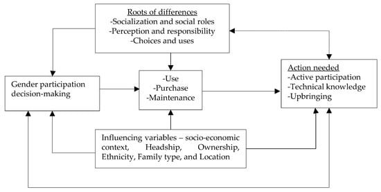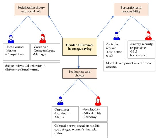 Second, energy perception and responsibility are further reasons for the gender difference in energy activities. Men are considered to work outside and are less focused on household work compared to women []. Women are careful about energy security due to the high responsibility of households, and this is seen as higher in married women having children, in particular. Men and women are different in their perception of the purchasing decision issues due to different moral development, and gender role regulates it (Figure 5).