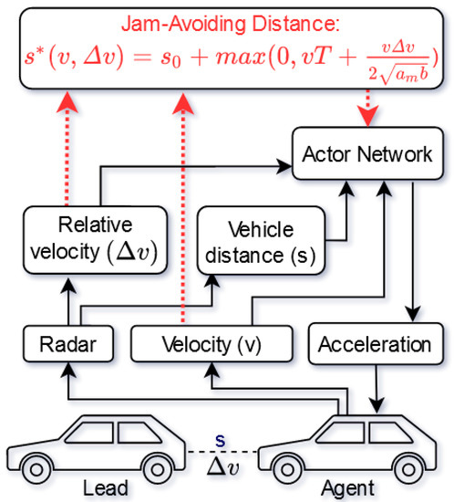 The main goal of the integration is to help the autonomous agent learn the correct control actions that result in reasonable trajectories. Regarding this aspect, one can distinguish essentially between supervised and non-supervised algorithms for such problems. Supervised approaches like constrained control algorithms [40] optimize a particular objective function constrained to some hard constraints which formalize safety requirements. By solving the respective constrained optimization problem, the ego-trajectory is guaranteed to satisfy the safety constraints. A major drawback of these supervised strategies is that they require target/reference trajectory points and velocities, to name only a few, which are usually difficult to obtain [41]. In contrast, RL cannot cope with hard constraints but poses them as soft constraints (where their severity depends on the regularization parameter ) onto the objective function. The main advantage is, however, that RL does not require any data but generates the data during training where it learns which trajectories and therefore, which control actions are reasonable in which situation by receiving reward feedback, so actions that severely violate the constraints lead to very low rewards. In our work, we design the regularization term of the reward function, i.e., the soft constraint, so that it represents the safety constraint in order to keep the optimal jam-avoiding distance, encouraging the agent to respect this safety constraint.