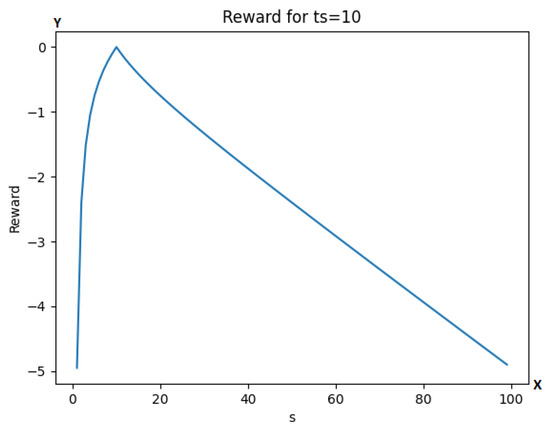 Graph of the reward function for different values of s at . The y-axis is representing the reward value, while the x-axis is representing the number of simulation steps.
