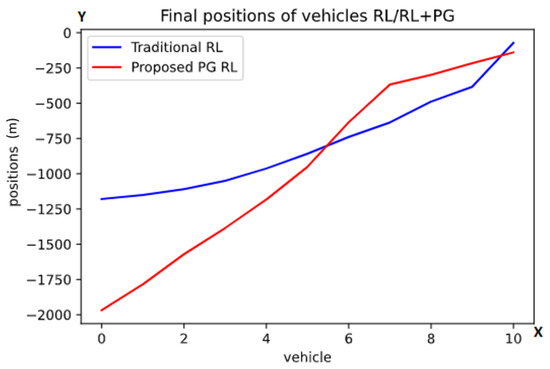 Graph of the finals positions after the first task with randomized inputs using the traditional RL (blue color) and the proposed PG RL (red color) models. The y-axis is representing the position behind the lead vehicle in meters while one point on the x-axis is referring to exactly one vehicle. These are the average final positions at the end of the scenarios, with the numbers referring to the vehicles (from back to front).