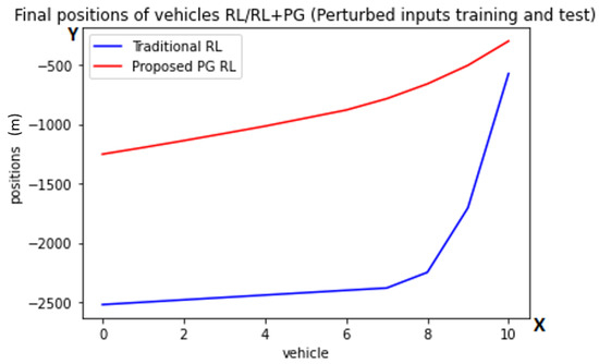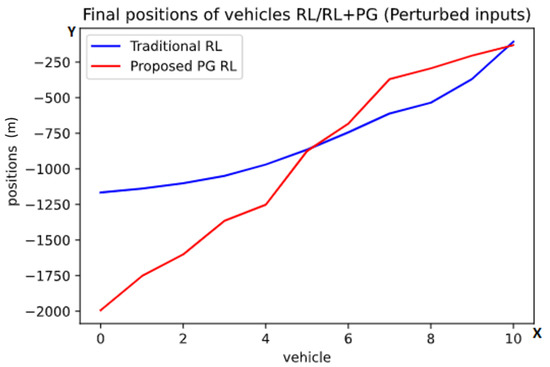 Graph of the finals positions after the first task with randomized inputs using the traditional RL (blue color) and the proposed PG RL (red color) models trained with perturbations. The y-axis is representing the position behind the lead vehicle in meters while one point on the x-axis is referring to exactly one vehicle. These are the average final positions at the end of the scenarios, with the numbers referring to the vehicles (from back to front).