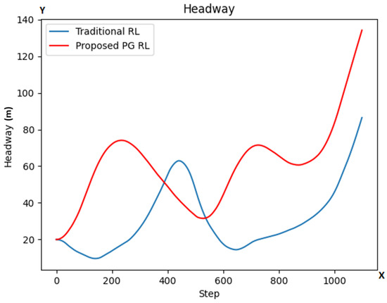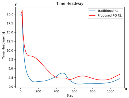 As we see in Figure 7, the THW in our PG RL model (red color line) is also at most steps higher than in the traditional RL model, with even its lowest points being higher. These results combined with the HW results suggest a more safe driving by our PG RL model than the traditional RL one.