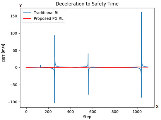 DST values at each step for both models (traditional RL in blue color line; our proposed PG RL model in red color line). The y-axis is representing the DST while the x-axis represents the number of simulation steps.