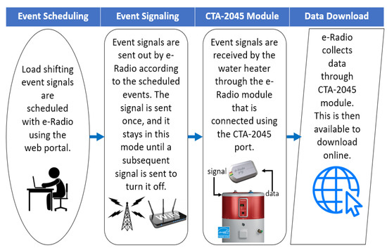 Data was downloaded from the e-Radio website through a web Application Programming Interface (API). The data collection process is described in Figure 1 in which a CTA-2045 module is used by e-Radio to send signals to the water heater and then retrieve the data. The CTA-2045 port that is built into the water heater tank provided an array of data that could be used to monitor water heater and communications network status as well as observe individual water heater behavior as needed. The following data were retrieved at one-minute intervals for analysis: