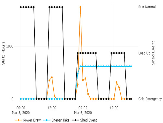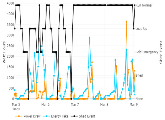 Table 7 provides load reduction results for example shed, critical peak and grid emergency commands implemented as part of the “smart” strategy, focusing on Thursday morning events between 3 February and 15 March 2019. This example averages the hourly load shaved over each command type. Positive(bold) values indicate a reduction in usage and negative values indicate an increase in usage. Even though the amount of shaving is not always higher for each hour, as the CTA-2045 control commands become more aggressive, the average over the five-hour events typically increases with more aggressive control commands.