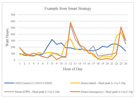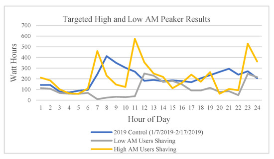 Table 6 shows interesting sample results from the targeted strategy. This example shows an average load reduction over two Thursday morning events (21 March and 28 March 2019). In this example of morning events, the low a.m. peaker group had a five-hour event, from 6 a.m. to 11 a.m. and the high a.m. peaker group had a three-hour event from 7 a.m. to 10 a.m. There is a large difference in the hourly peak-shaving capability between these two groups.