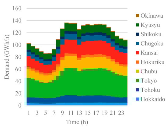In this study, we simulated the supply and demand of the Japanese electrical power system for one year (8760 h) in 2030, based on scenarios presented in a Japanese government report []. The Japanese electricity supply system is divided into 10 longitudinal areas and is connected by interconnection lines. The annual demand for each area was determined by comparing the total national electricity demand in the energy conversion case of the Japanese government’s report [] with the actual electricity generation of each area in 2013. The average daily electricity demand profile for each area is shown in Figure 1. The power demand of the EV fleet is discussed in Section 3.2. Interconnection lines between the regional grids were provided (except for Okinawa), and their capacities are shown in Table 1. The capacities of the interconnection lines differed according to the direction, and the energy loss due to transmission was assumed to be 0.2~4.1%. LFC adjustments based on the margins of the interconnection lines have yet to be realized, as they are currently under institutional discussion in Organization for Cross-regional Coordination of Transmission Operators (OCCTO) []. Therefore, following previous study [], we assumed that 10% of the interconnection capacity could be used for LFC adjustment.