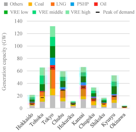 The available generation capacity and peak annual electricity demands are shown in Figure 2. VRE capacities were assumed for the three scenarios, as shown in Table 2. The low-capacity scenario was established based on a report by the Japanese government [], and the middle-capacity scenario was based on the resource potential, scale of each area, past implementation results, and industry outlook, with reference to the literature []. The high-capacity scenario was based on regional heterogeneity, and the total national VRE capacity was set to be approximately 1.5 times higher than that of the middle-capacity scenario. The hourly PV power generation output was estimated based on solar radiation, temperature, and wind speed data for each area in 2013. The hourly WT power generation was based on wind farm data recorded in 2013; specifically, those of coal, liquefied natural gas (LNG), and oil thermal generators were set at 106, 200, and 86 units, respectively. The rated capacity, minimum power output, thermal efficiency in partial-load operations, and fuel costs were established for each thermal unit. The fuel cost for partial-load operations was approximated using a piecewise linear cost curve between the rated and minimum power. In Japan, oil, LNG, and coal have the highest fuel costs (in that order), as shown by a typical thermal power generation unit in Table 3. PSHPs are located in areas with high peak demands, such as Tokyo, Kansai, Chubu, and Kyushu. Constant- and variable-speed PSHP generation values were set at 103 and 15 units, respectively. The rated capacity and minimum power output were each fixed, based on these unit values. For all PSHP units, the storage capacity was 8 h, and the efficiency was 0.7. In Figure 2, the other power sources included hydroelectric, nuclear, geothermal, biomass generation, and demand-side cogeneration. These power sources were non-flexible, and their hourly generation values were obtained exogenously and excluded from the optimization target.