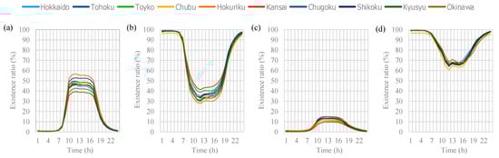 Hourly existence ratio of EVs in each area: (a) weekdays at the workplace, (b) weekdays at home, (c) holidays at the workplace, and (d) holidays at home.